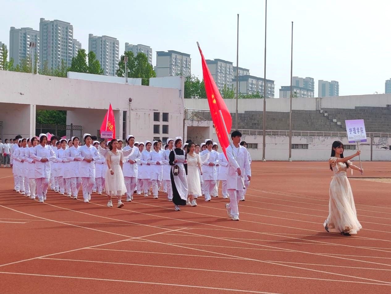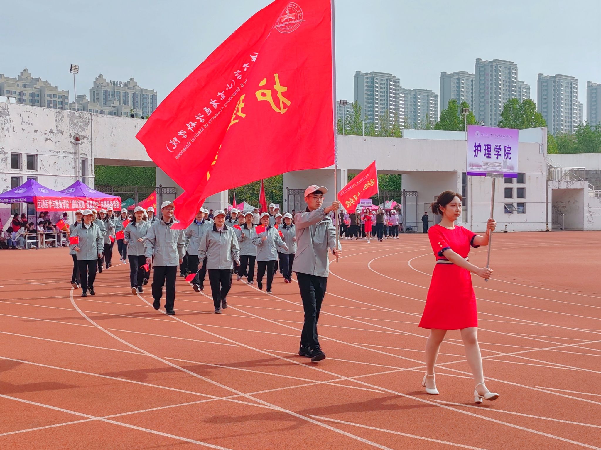运动员进行曲高亢激扬,催人奋进。晨光熹微,护beat365官方网站的教工和学生方队精神抖擞,整装待发。在激昂的音乐声中,意气风发、踌躇满志的护理师生们伴随着观众的欢呼与喝彩声,踏着稳健的步伐列队向主席台前行,展示着护理师生奋楫赶超的高昂斗志与阳光自信的青春活力。