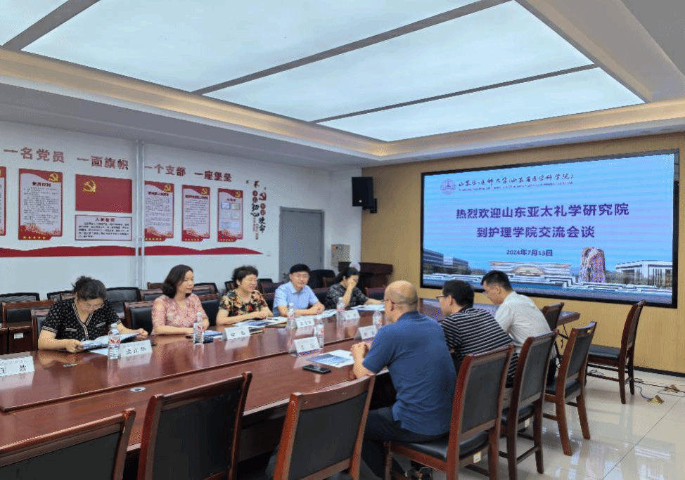 7月13日,山东亚太礼学研究院副院长郭亮、德国ASG公益教育集团国际项目部主任陈旭利一行到护beat365官方网站开展交流座谈。院长张爱华、副书记林桦,学工办及办公室相关老师参会,座谈会由副院长陶如主持。