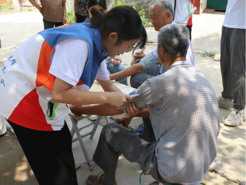 护理学子在户外进行义诊活动,为在室外乘凉的老年人测量血压,根据测量结果为老人提供健康生活相关建议。