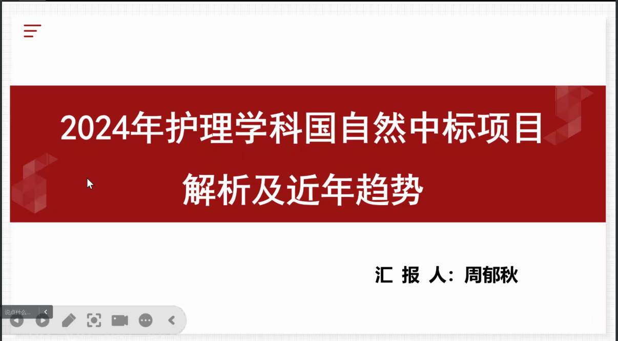 周教授从2024年护理学科国自然立项概况、护理学科国自然研究设计解析、护理学科国自然研究的热点及趋势三个方面,结合个人体会,分析了当前护理科研的发展趋势,并针对护理科研的基本步骤包括项目选题、研究设计、资料收集以及提高项目申报成功率的关键技巧等内容进行了详细阐述和经验分享。周教授强调,课题申报不仅是对个人科研能力的检验,更是对护理专业发展的促进,她鼓励学院师生要有坚定的决心,不断追求科研创新。