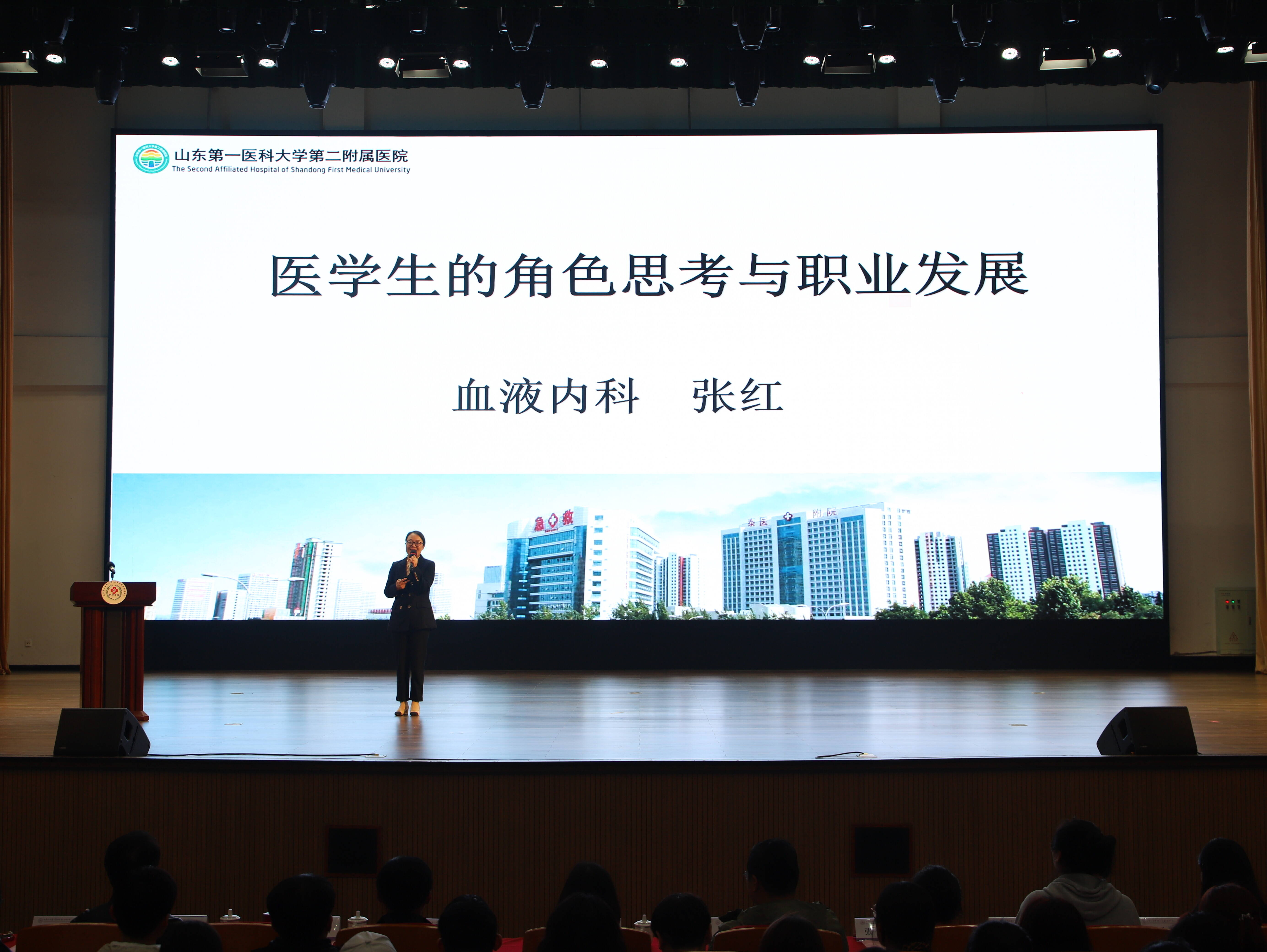 校(院)“青年讲师团”成员、第二附属医院血液内科副主任张红以“医学生的角色思考与职业发展”为题,为同学们未来的职业发展提供了全新的思路。她结合自身多年的从医经历和丰富生动的医学案例,强调医学生要从学医开始,就找准自身职业定位,主动将个人的成长融入国家发展大局,主动担当起新时代青年医学生的责任和使命,为健康中国建设贡献自己的青春力量。