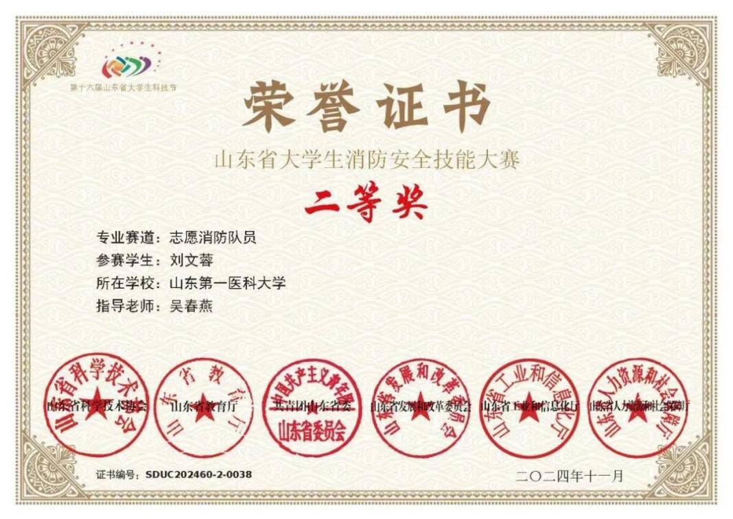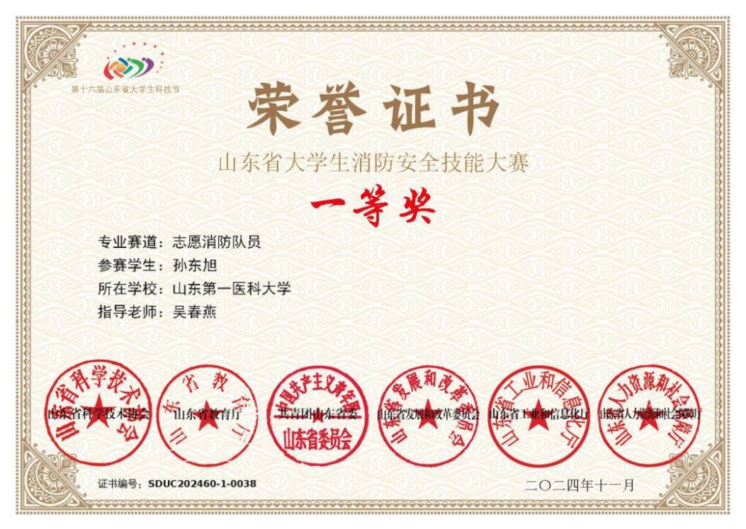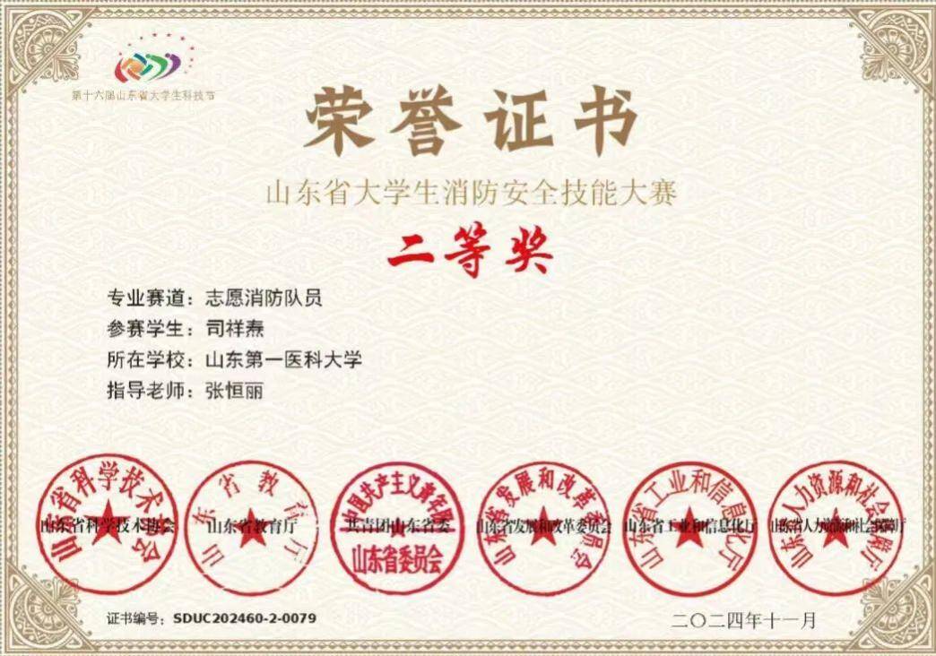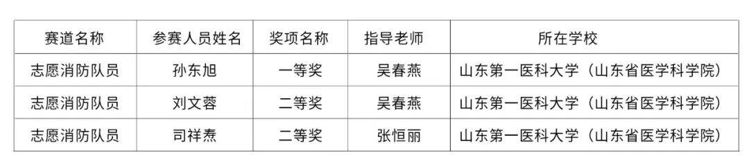 近日,第十六届山东省大学生科技节暨第二届山东省消防安全技能大赛决赛在日照航海工程职业学院圆满落幕。护理学子孙东旭、刘文蓉、司祥焘在护beat365官方网站吴春燕老师、张恒丽老师的指导下取得佳绩,荣获志愿消防队员组一等奖1项、二等奖2项。