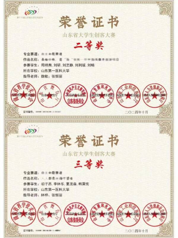 其中,在由济南市科学技术协会、济南创新方法研究会承办的“未来领袖杯”第九届山东省大学生创客大赛中,我院共两项作品获奖,其中司祥焘等五名同学组成的团队获得二等奖,初子昂等四名同学组成的团队获得三等奖。