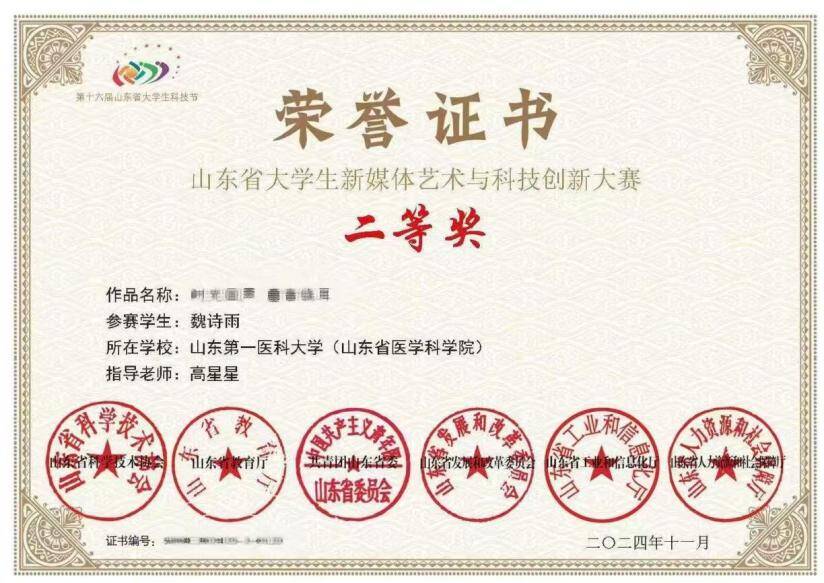 在由山东省科普创作协会、山东工艺美术学院、中国海洋大学出版社有限公司承办的山东省大学生新媒体艺术与科技创新大赛中,魏诗雨同学获得二等奖。