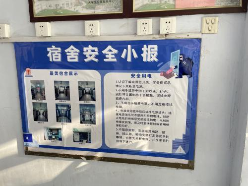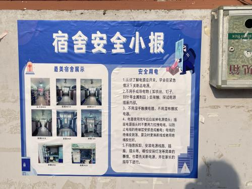 与此同时,自管会卫生部干事们也在紫薇园、玉兰园和桃园的宿舍楼前张贴“宿舍安全小报”,为同学们普及安全用电知识并展示了学院最美宿舍的风采。
