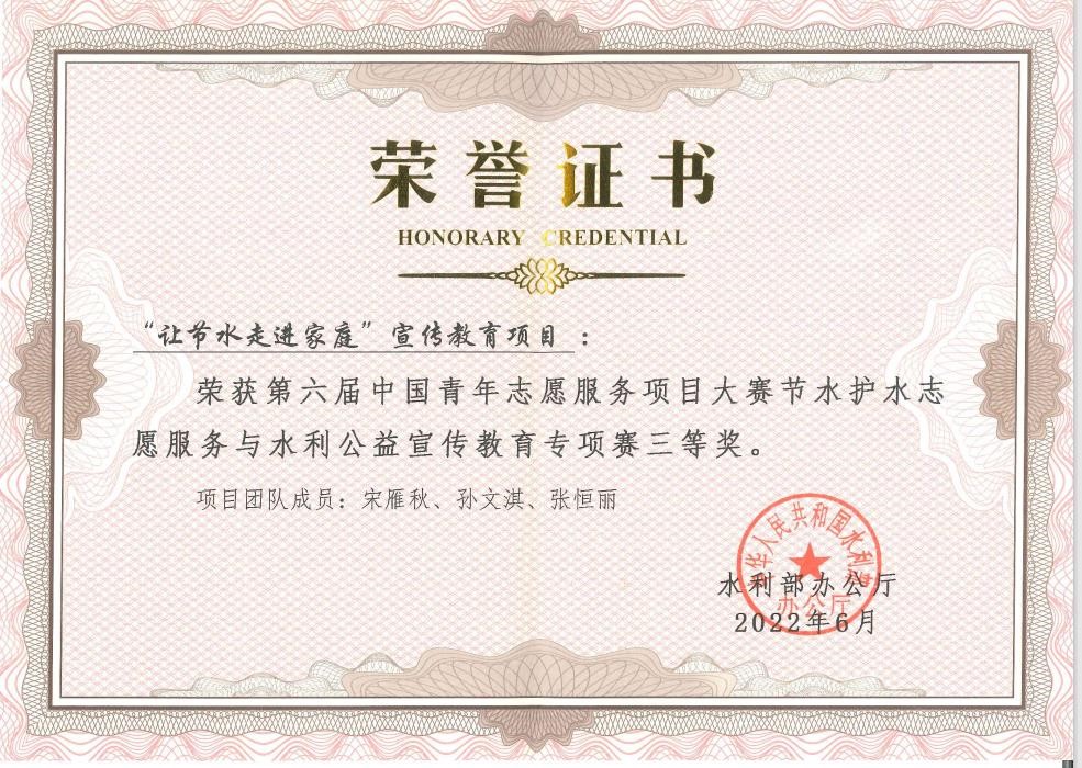 近日,beat365官方网站志愿服务项目——《让节水走进家庭》在第六届中国青年志愿服务项目大赛中荣获三等奖,这是山东省唯一一个在本次赛事水利公益宣传教育项目赛道中获奖的项目。
