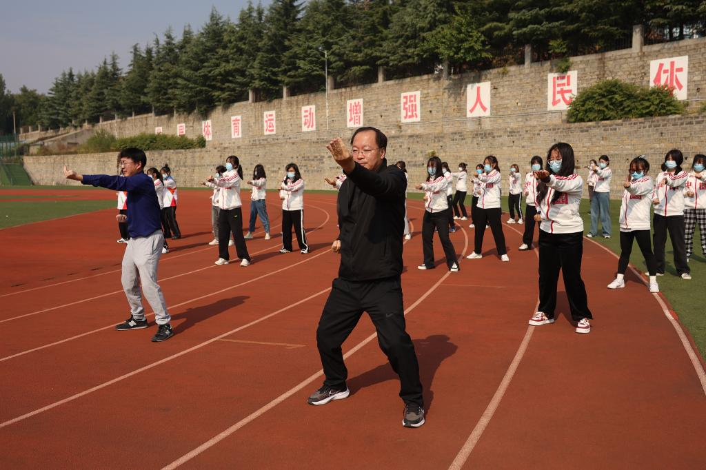 活动中,李栋与同学们一起练习“八段锦”,并给大家讲述“八段锦”的学习要领,主要是通过呼吸气息的调整、身体活动的调整和意识的调整,达到三者浑然一体,从而起到强身健体、防病治病的目的。