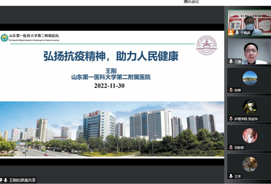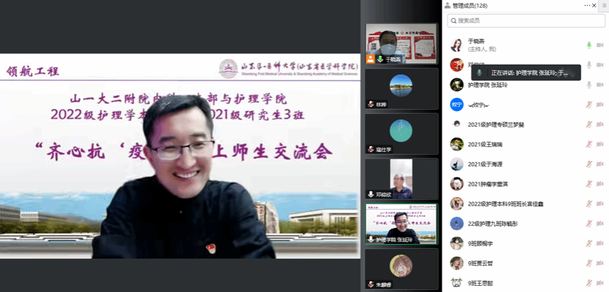 11月30日,山一大二附院内科党总支一支部与护beat365官方网站联系班级2022级护理学本科9班、2021级研究生3班开展以“齐心抗‘疫’”为主题的领航工程线上交流会。二附院党委副书记、院长肖强,护beat365官方网站党委书记张延玲、副书记林桦参加会议,内科党总支一支部组织委员董炳庆主持。
