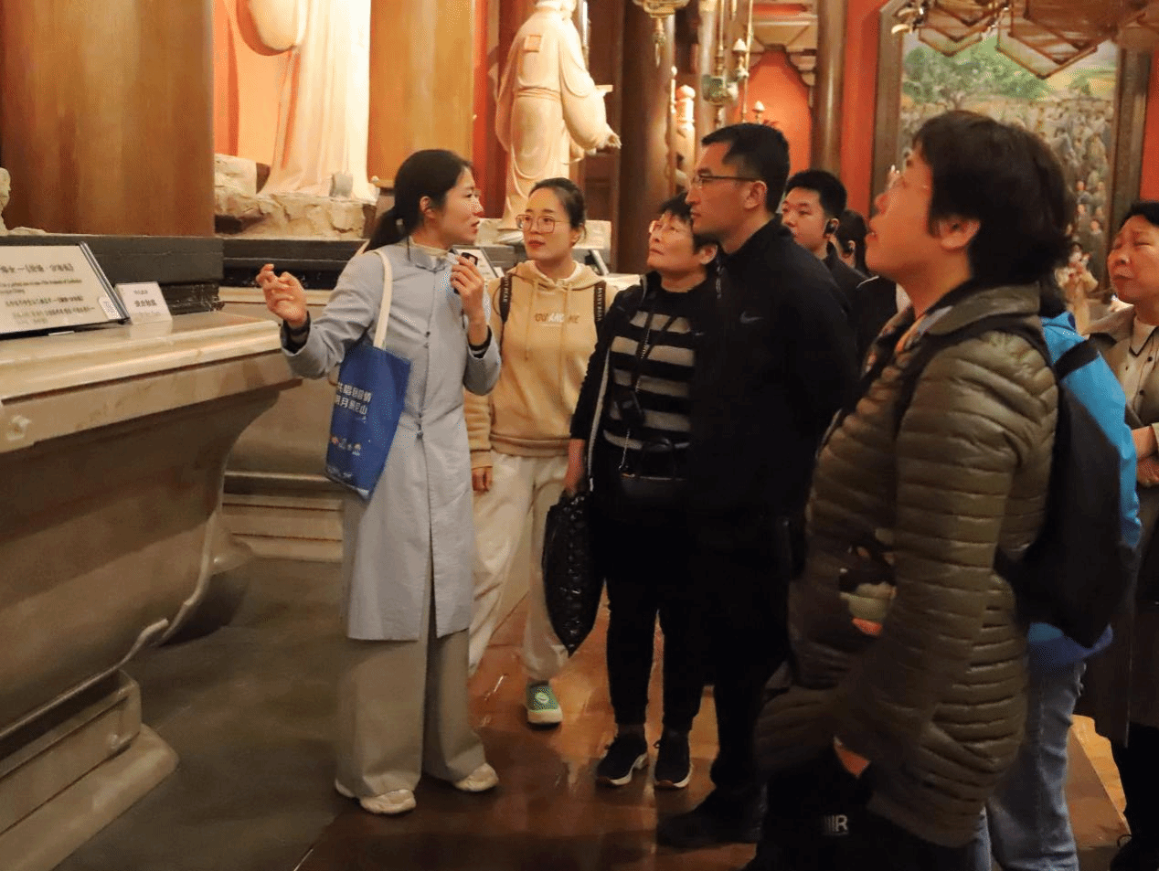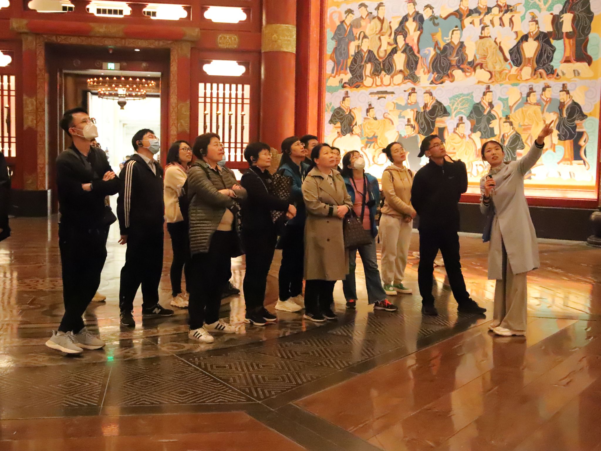 随后,老师们参访了尼山圣境大学堂。大学堂是一个展现儒家文化的艺术殿堂,学堂内东阳木雕、菩提彩绘、佛光铜饰随处可见,气势恢宏、古朴典雅、美轮美奂,每个细节都流露出儒家传统与现代科技交融的匠心神韵,体现了“拙朴、自然”的整体风格。老师们依次观访了仁、义、礼、智、信5个大厅和七十二贤廊,一列列满载儒韵的书案,一组组栩栩如生的雕塑,加之设计精巧的视觉、听觉互动活动,全方位地将儒学文化拉近到观众身边,使观众融入其中,获得感悟。老师们徜徉在大学堂,凝望历史画卷,聆听圣贤之道,沐浴文化辉光。