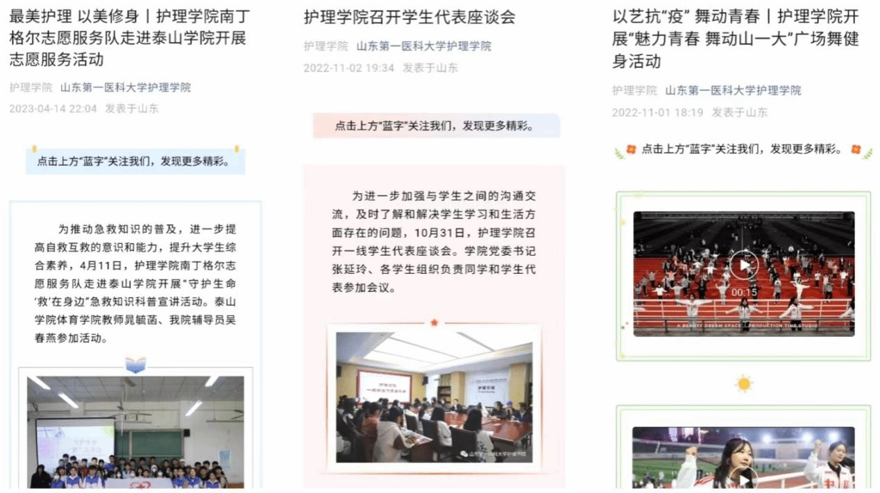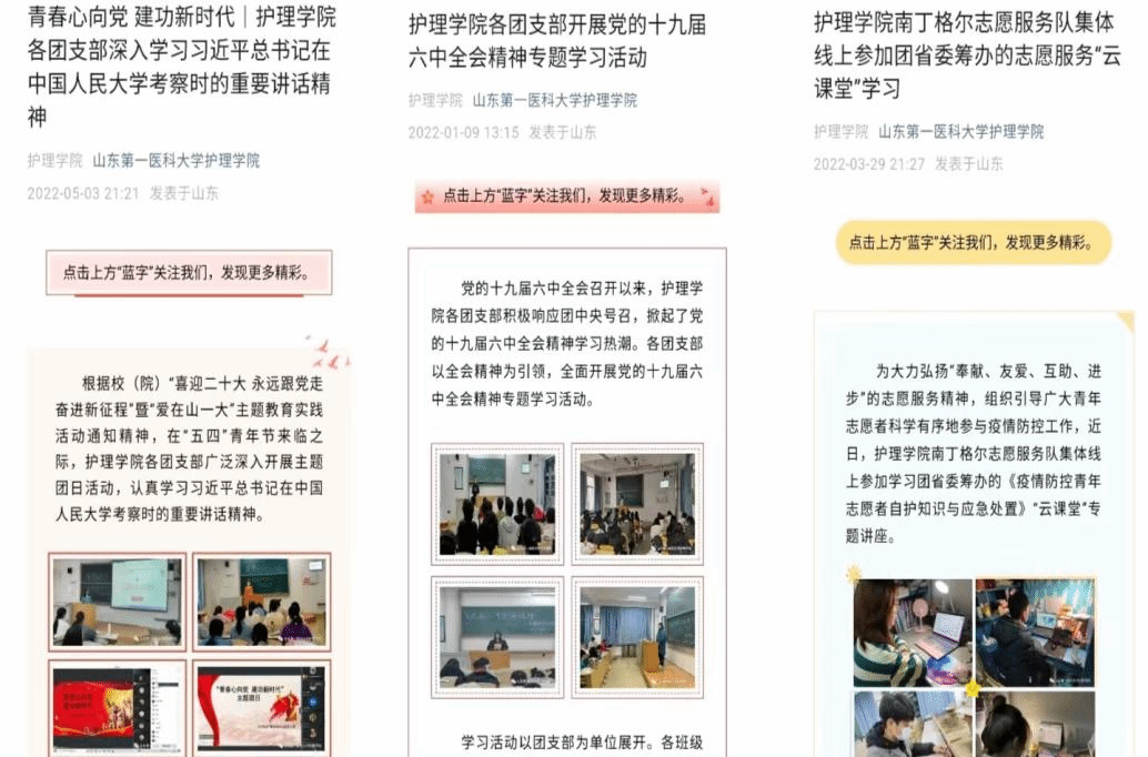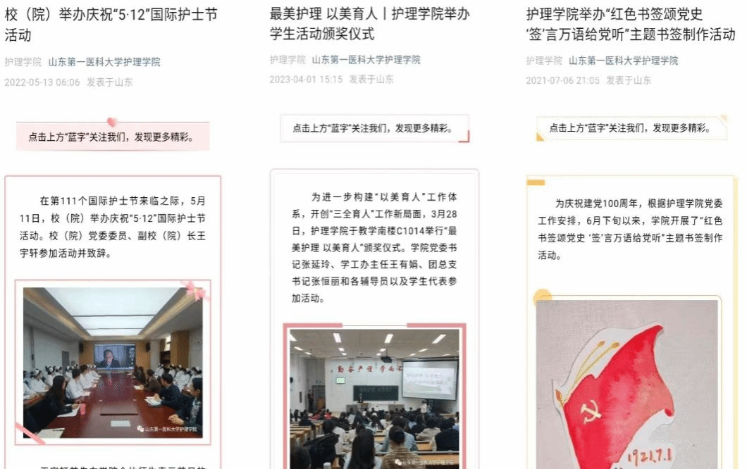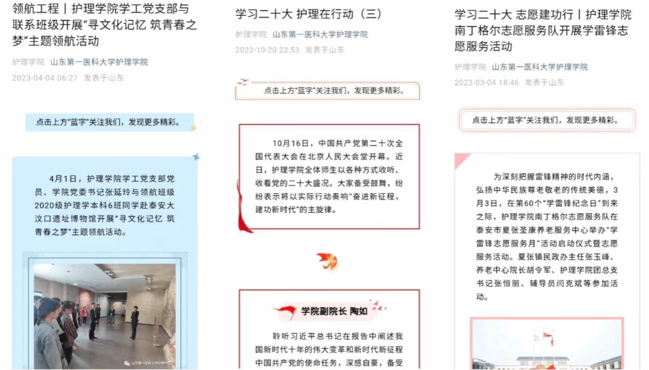 采用“线下”+“线上”的方式,线下开创“红色宣讲团”,创新开启小班宣讲模式,将党的故事宣讲好、传播好、实践好;加强护beat365官方网站和南丁格尔志愿服务队两个微信公众号的建设,线上推出“学习二十大 护理在行动”“学习二十大 志愿建功行”、红色大讲堂、“护”理党史等系列推文,强化舆论阵地。