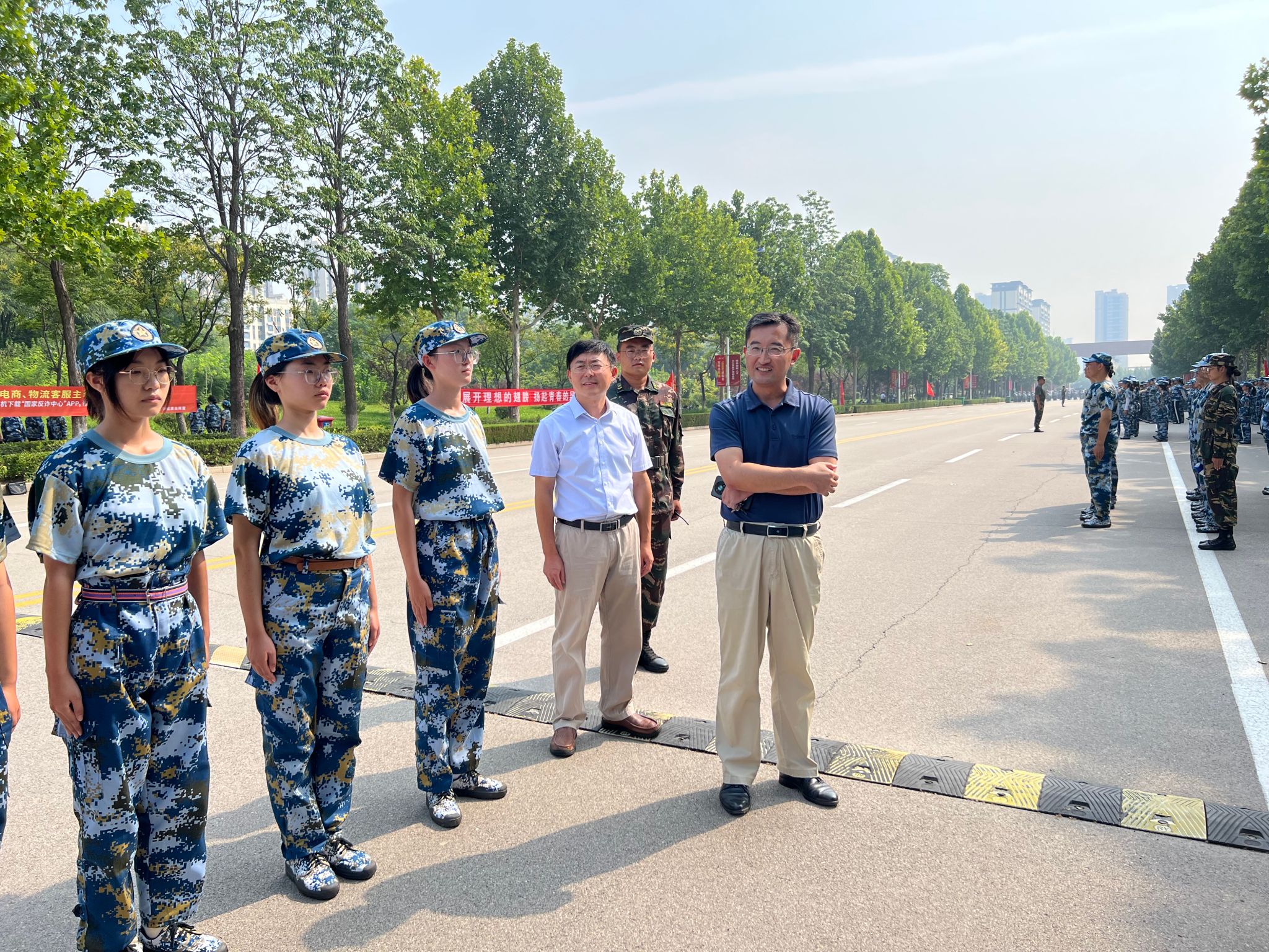 9月1日,护beat365官方网站党委书记张延玲、副书记林桦和2023级辅导员来到护beat365官方网站军训场地,看望正在军训的教官和2023级新同学。