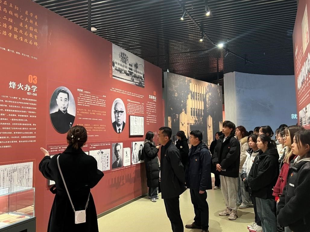 仪式结束后,作为开班第一课,青马班开展了“传承山一大薪火,弘扬自强不息精神”主题团日活动,学员们跟随讲解员,在校史馆内参观学习。学员们认真聆听讲解员娓娓道来“一部家谱,五个故事”,了解学校的发展史,重温了那段峥嵘岁月,认真聆听了校(院)科教融合以来取得的巨大成就。展板上记录珍贵校史资料的文字图片,展柜中摆放的具有深刻纪念意义的物品和文献资料,全方位、多角度地展现了校(院)的历史文化沉淀和卓越的发展成就。