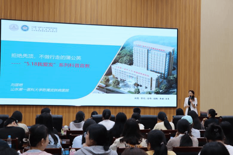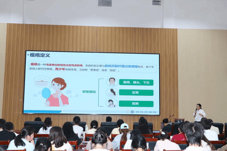 活动中,刘国艳为班级学生带来了题为《拒绝秃顶 不做行走的“蒲公英”》的讲座,她结合自身工作经历和临床实践,为班级同学进行了常见脱发疾病的科普宣教;杨青为班级学生带来了“痤疮”相关知识科普讲座,讲座条理清晰、细致入微、干货满满。