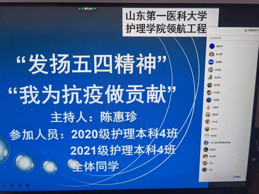 4月27日,护理系党支部书记陈惠珍与联系班级——2020级护理学本科4班、2021级护理学本科4班开展以“发扬五四精神 我为抗疫做贡献”为主题的座谈活动。会上详细介绍了校(院)疫情防控的相关措施和反映问题的相关渠道,解读了“五四精神”的内涵,同时回答了同学们关心的问题。