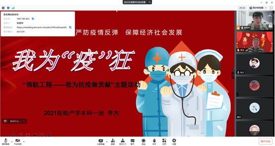 4月27日,助产系党支部党员陈丽萍与联系班级——2021级助产学本科1班以线上的方式开展“领航工程——我为抗疫做贡献”主题交流活动。活动中,大家共同重温了“山一大精神楷模”白晓卉同志的抗疫事迹,学习了校(院)疫情防控的相关要求与举措,传达了学院老师对同学们的关心关怀。