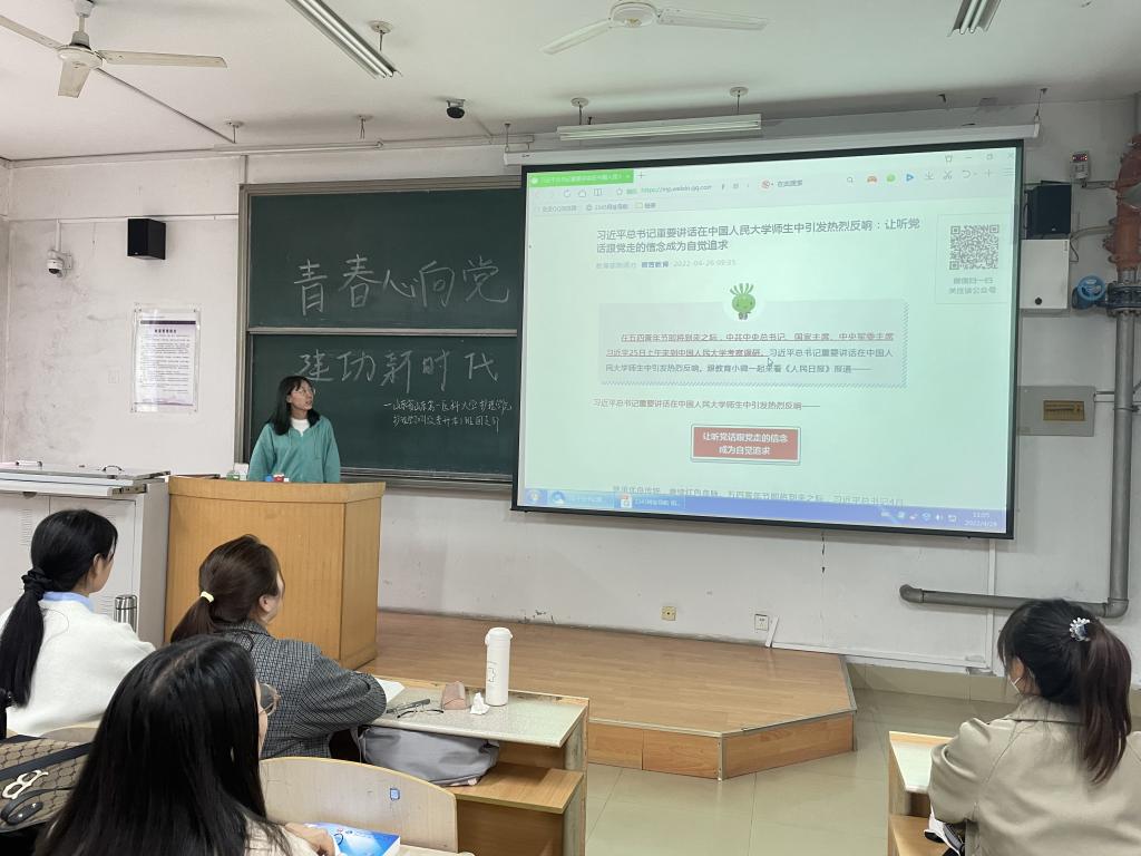 根据校(院)“喜迎二十大 永远跟党走 奋进新征程”暨“爱在山一大”主题教育实践活动通知精神,在“五四”青年节来临之际,护beat365官方网站各团支部广泛深入开展主题团日活动,认真学习习近平总书记在中国人民大学考察时的重要讲话精神。