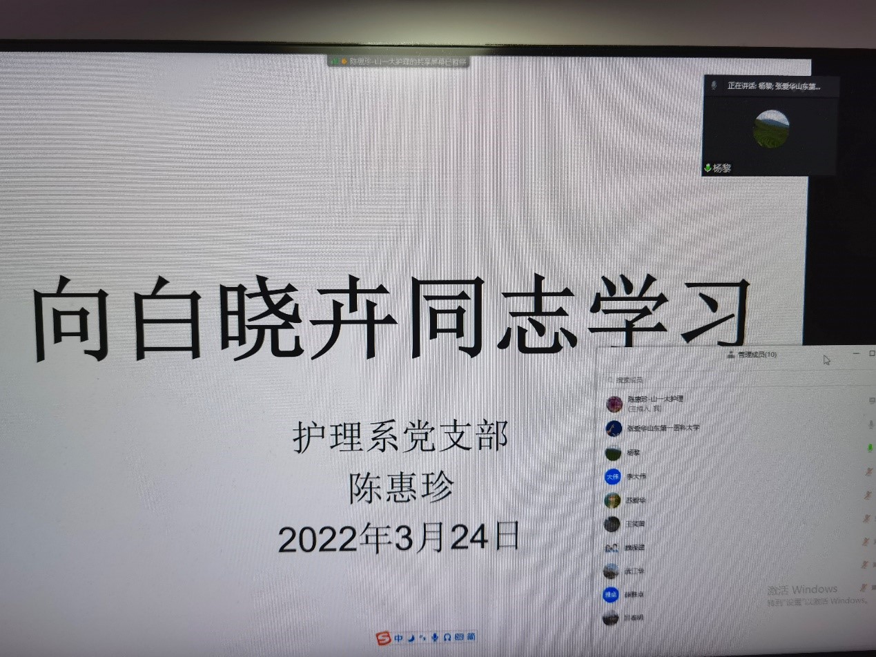 在护理系党支部全体党员会议上,支部书记陈惠珍对白晓卉同志的事迹做详细介绍,全体同志对白晓卉同志爱岗敬业、鞠躬尽瘁、死而后已的精神敬佩不已。同志们表示,要以白晓卉同志为榜样,对党忠诚、不负人民,不管是在抗击疫情方面,还是在教书育人方面,不忘初心、牢记使命、尽职尽责、任劳任怨,充分发挥先锋模范作用。