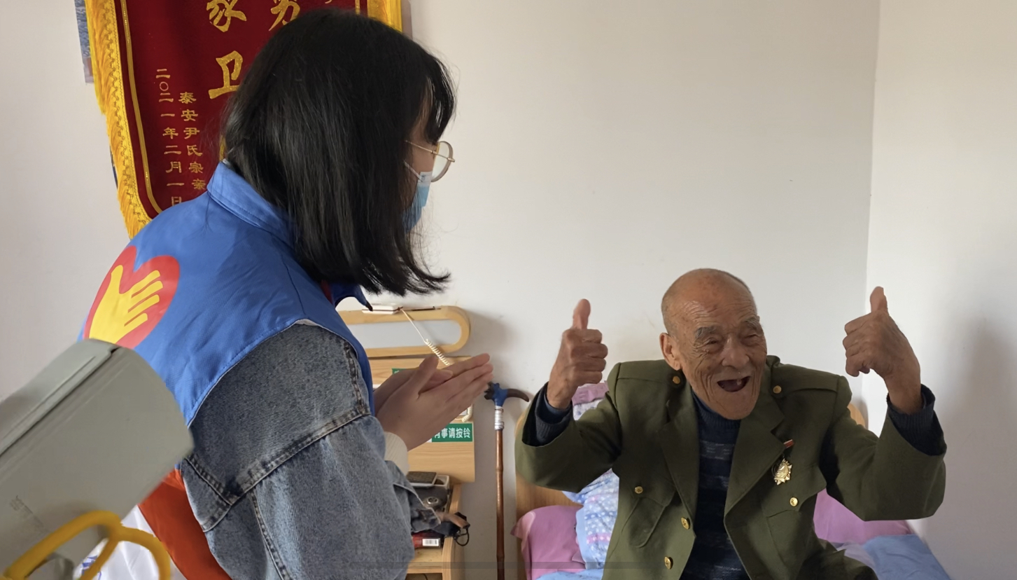 泰安康年银龄颐养院内有约六十名老人,八九十岁居多。颐养院环境宽阔明亮,有干净整洁的院落和宽敞舒适的房舍。夏有空调,冬有暖气,娱乐设施齐全,老人们在这里能够享受温馨的生活,度过一个幸福的晚年。活动期间,服务队队员们在颐养院陪老人们聊天谈心,询问他们的生活状况,同时耐心地为老人按摩,帮助老人们量血压,关心老人身体健康状况,帮助老人放松身体。志愿者们悉心听革命老军人讲红色故事,坚定了跟党走、办实事的信念。志愿者们为老人们送去贺卡,带给他们最真挚的节日祝福。在服务队队员的努力下,现场活动秩序井然,有条不紊的进行,获得了老人们及工作人员的一致认可。