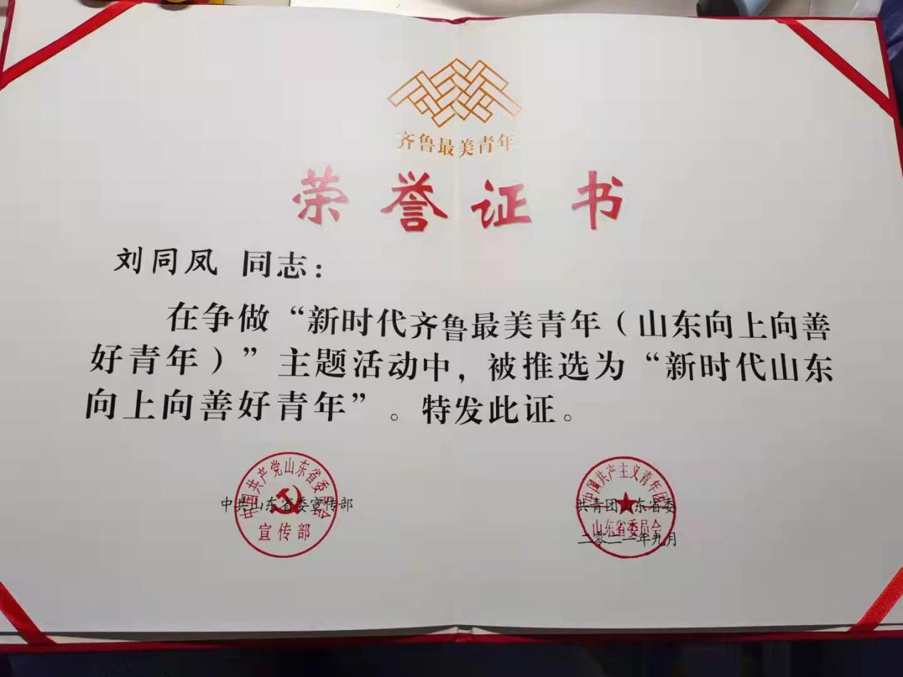 近日,由中共山东省委宣传部、共青团山东省委、大众报业集团(大众日报社)、山东广播电视台、山东省青年联合会、山东省学生联合会组织开展的“新时代齐鲁最美青年(山东向上向善好青年)”主题活动评选结果揭晓。护beat365官方网站刘同凤同学荣获“新时代山东向上向善好青年”称号。