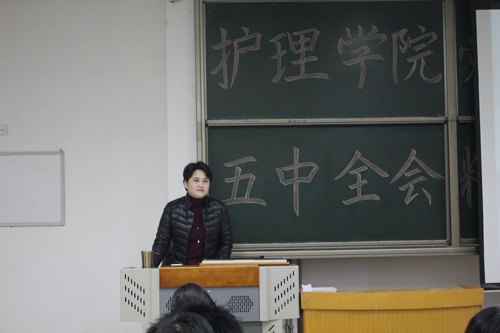 11月27日下午,护beat365官方网站在教学南楼C2009室举办了党的十八届五中全会精神宣讲会。宣讲会由党委宣传部长宋巧霞主讲,护beat365官方网站教工党员和部分学生党员及入党积极分子共220余人听取了报告。