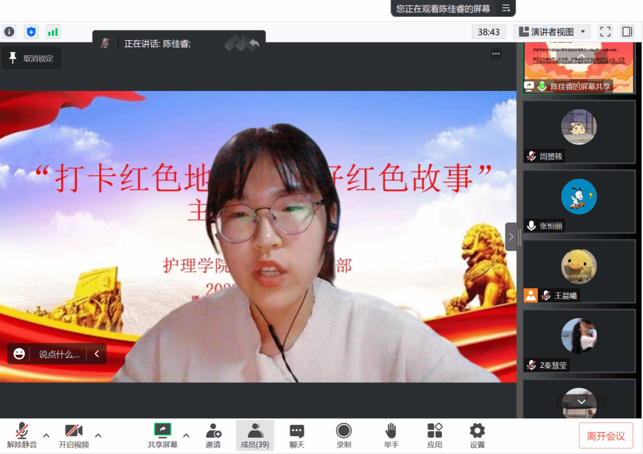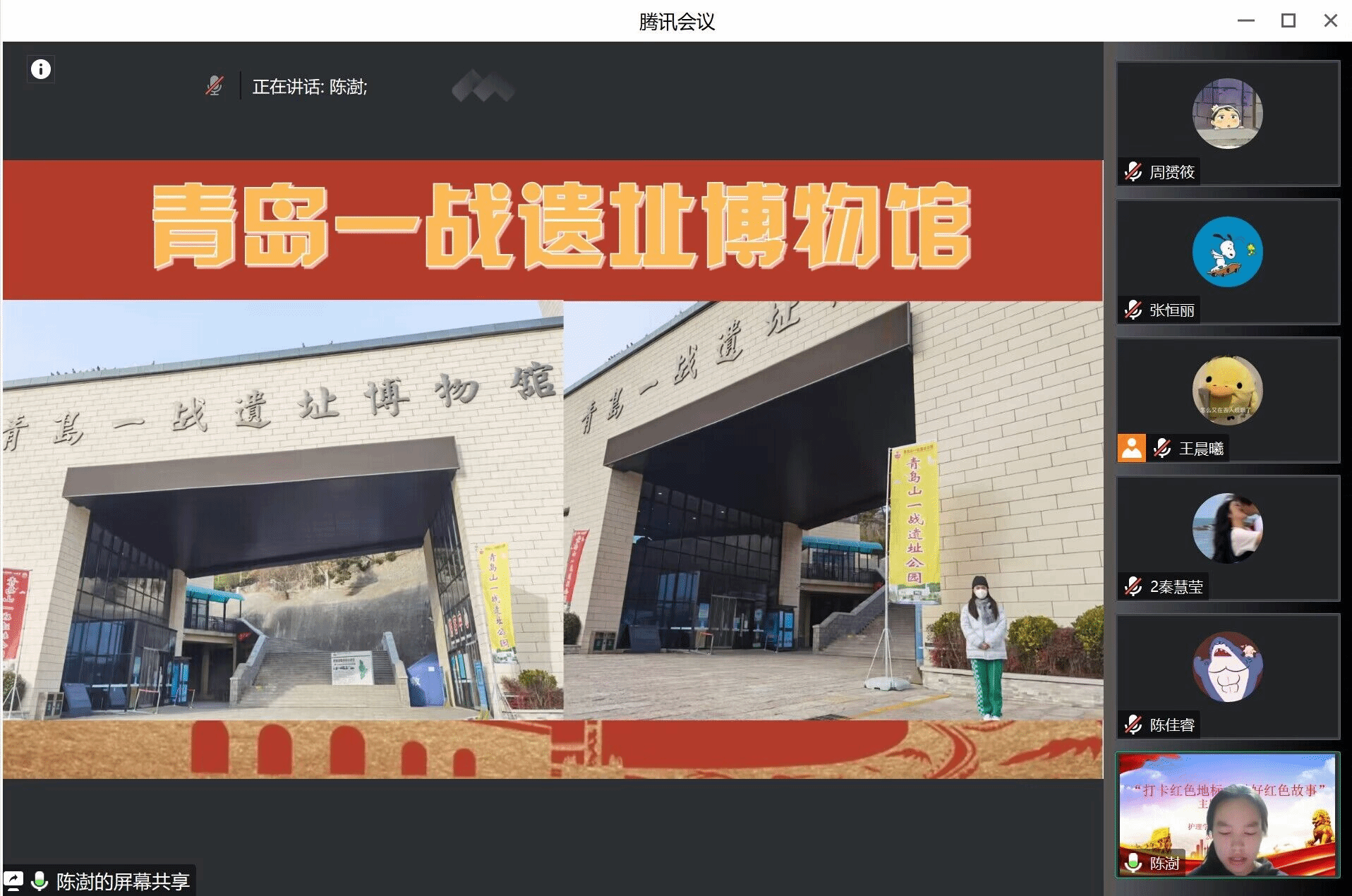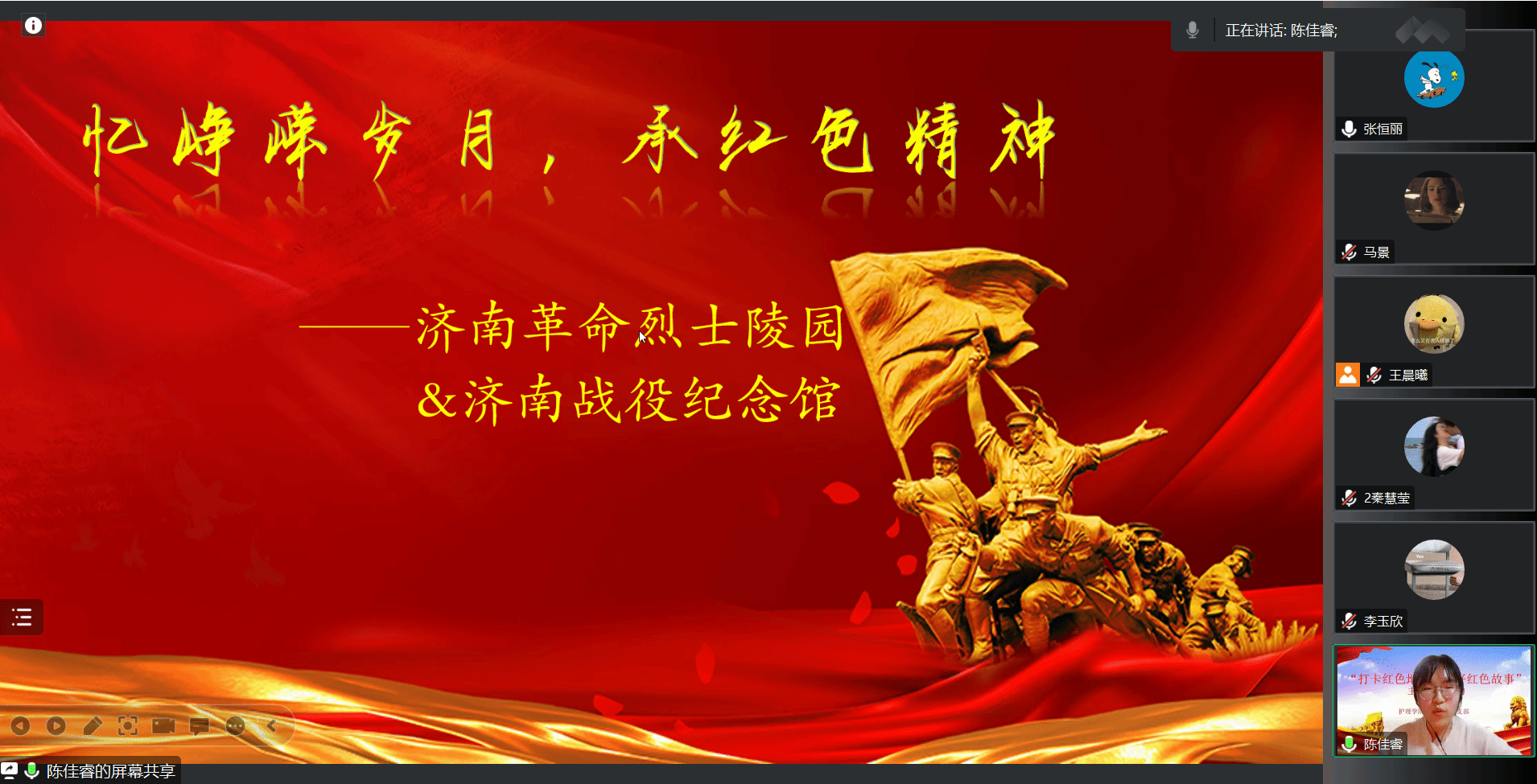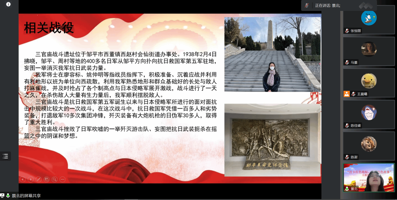 分享会上,共有六名党员同志按照抽签顺序进行了红色故事分享。周赟筱同志实地参观了青岛革命烈士纪念馆,秦慧莹同志到了位于潍坊市昌乐县的张适烈士纪念馆,李玉欣同志为我们详细介绍了位于山东潍坊寿光文圣街的陈毅担架连纪念雕塑的故事,陈佳睿同志打卡济南革命烈士陵园,陈澍同志深入青岛山一战遗址公园,景北同志则走访了邹平市烈士陵园。他们结合参观的实景实况,用ppt、视频等形式,以平实的语言生动讲述了先烈们的英雄事迹,再现了当时的革命历史。