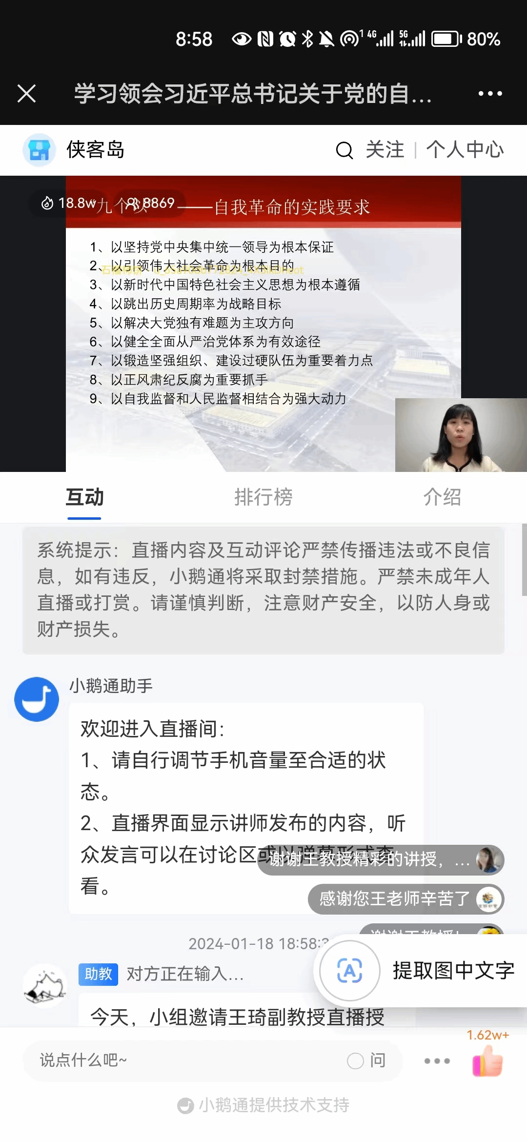 为巩固学习贯彻习近平新时代中国特色社会主义思想主题教育学习成果,1月18日晚,护beat365官方网站学生第四党支部全体党员线上共同观看学习中共中央党校王琦教授讲授的“学习领会习近平总书记关于党的自我革命的重要思想”直播课。