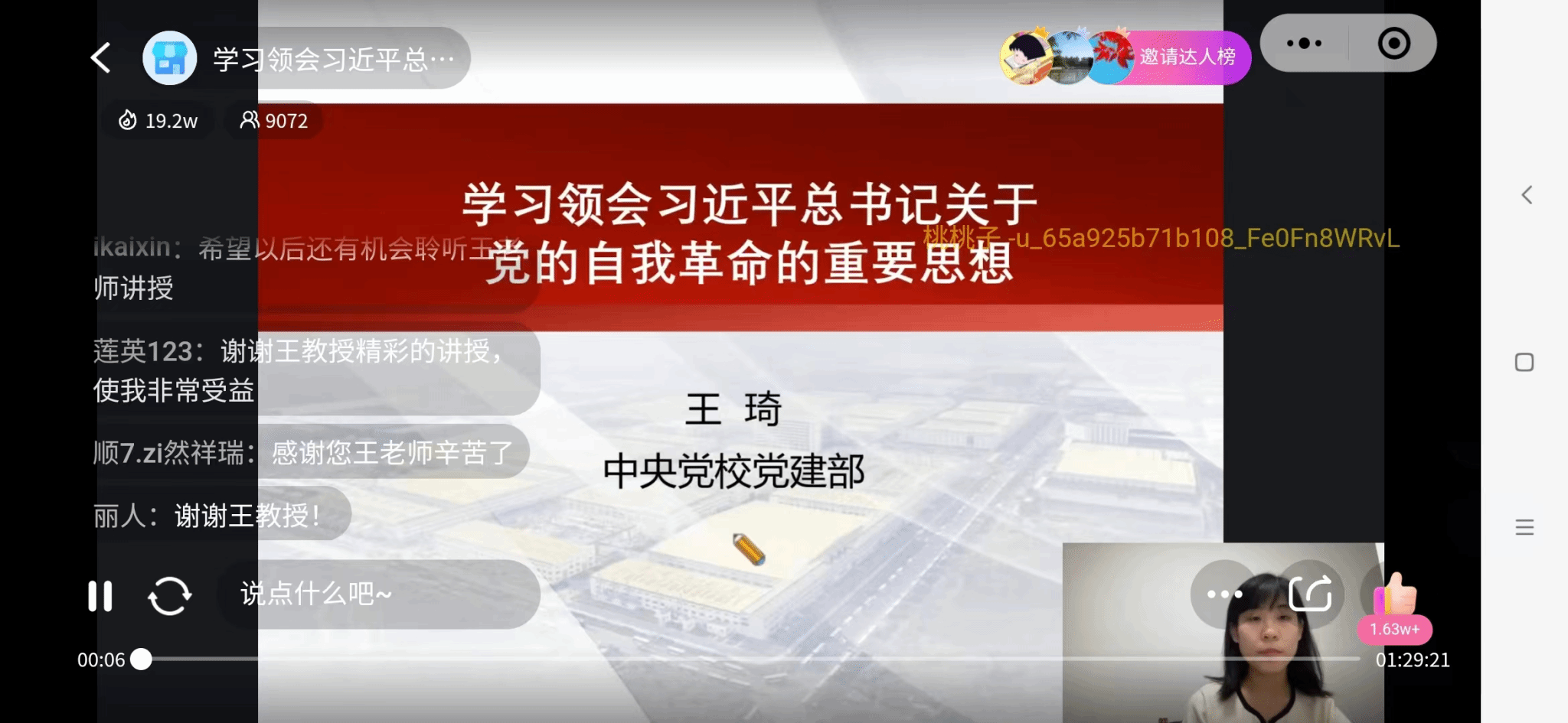学生第四党支部负责同志表示,中共中央党校王琦教授的直播授课为大家深入学习习近平总书记关于党的自我革命的重要思想、不断增强思想认同情感认同及理论认同,提供了很好的思想引领和指导,大家要内化于心、外化于行,彰显一名优秀共产党员的形象和本色。