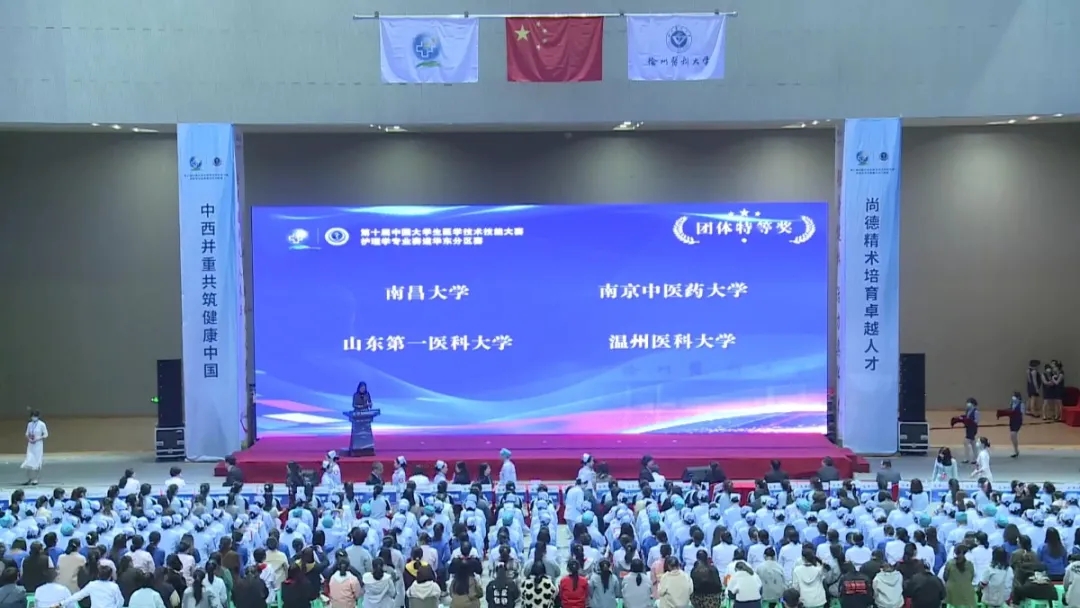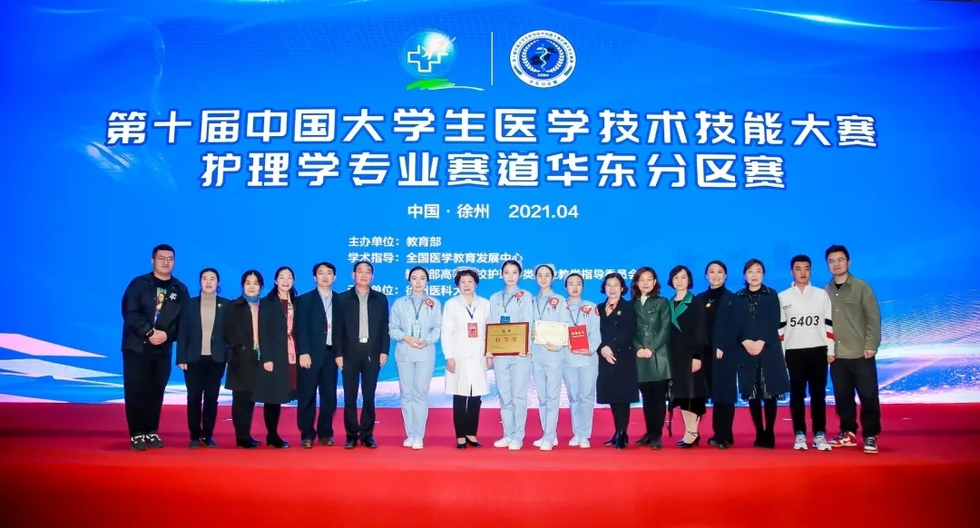 中国大学生医学技术技能大赛,是独具中国特色的高端医学教育赛事,自2010年以来,已走过十年风雨,堪称医学生的“奥林匹克”。本次大赛的主题为:“尚德精术培育卓越人才中西并重共筑健康中国”。大赛于今年首次增设护理类专业赛道,其华东分区赛由徐州医科大学承办,参赛队伍分别来自上海市、浙江省、江苏省、山东省、安徽省、江西省、福建省等62所高校,由毕业实习阶段的护理本科生组队参赛。大赛初赛为多站式,按人的生命周期,从第一站到第8站排列,考核范围涵盖基础护理学、急危重症护理学、内科护理学、外科护理学、妇产科护理学、儿科护理学、健康评估、老年护理学、社区护理学等。通过初赛32支队伍晋级复赛,复赛采用“赛道式”考核,以临床案例和场景为轴,重点考察学生解决复杂问题的能力和临床思维能力,通过复赛12支队伍晋级决赛。护理专业赛道华东分区赛设立特等奖4个、一等奖8个、二等奖19个、三等奖32个。