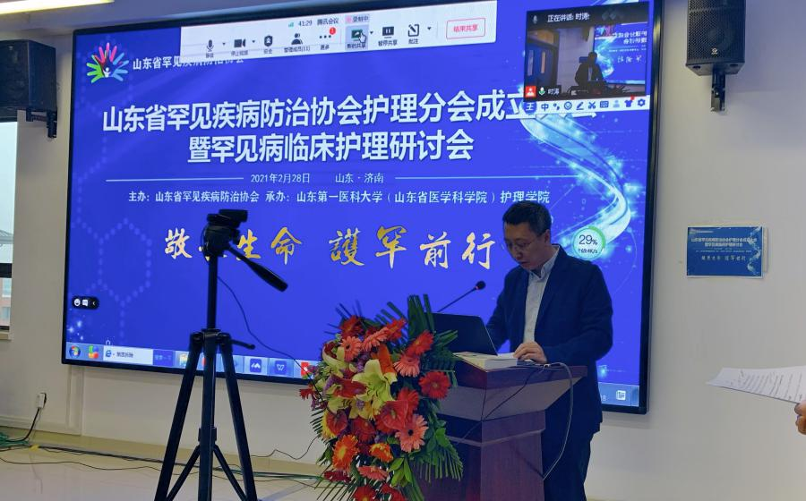 山东省医学会罕见疾病分会候任主任委员、山东省罕见疾病防治协会秘书长崔亚洲,beat365官方网站院长柳韦华,北京病痛挑战基金会副秘书长孙荣甲出席会议。来自全省各医院的山东省罕见疾病防治协会罕见病护理分会委员,通过线上线下同步视频会议的方式参加会议。