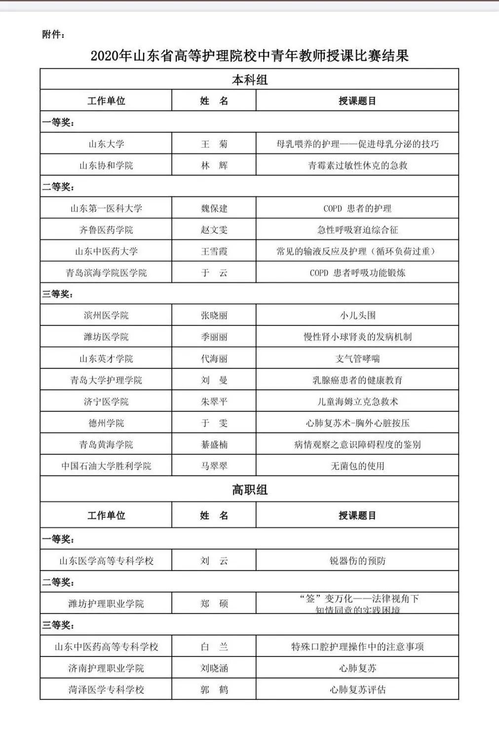 山东省高等护理院校中青年教师授课比赛是山东省护理学会为深入贯彻落实中共中央、国务院印发的《中国教育现代化 2035》和全国教育大会精神,加快建设高素质专业化创新型教师队伍,促进医教协同背景下的教育教学改革,提高中青年教师教学能力与水平的一项重要举措。全省共有14家护理本科院校参赛。