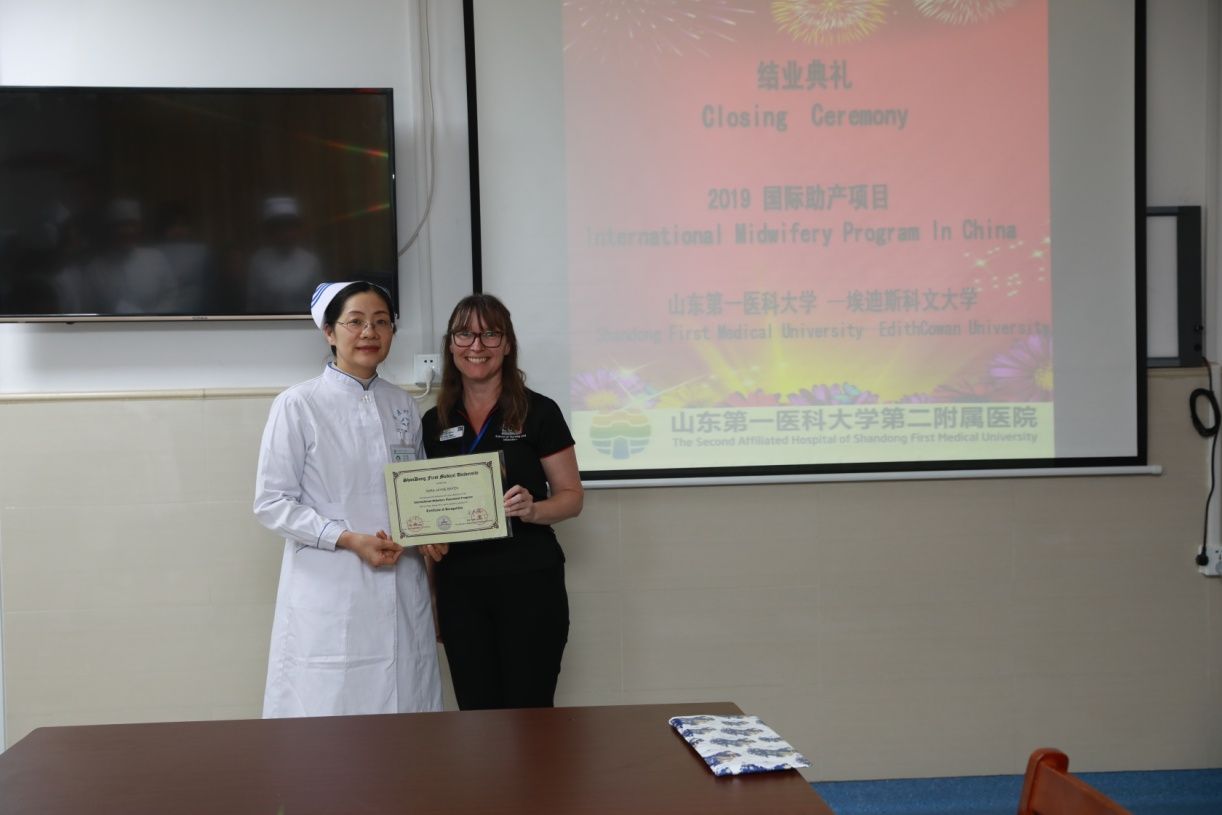 此后,国际助产实习项目结业典礼在第二附属医院举行,护理部杨朝霞主任为ECU师生颁发了学习证书,学生和带教教师分别分享了实习体会和带教体会。