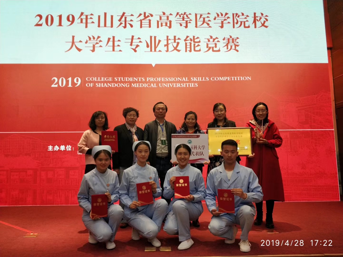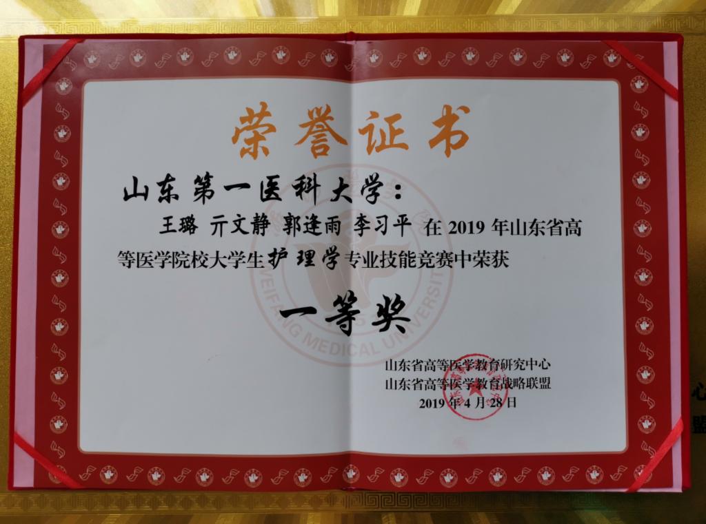4月27至28日,2019年山东省高等医学院校大学生专业技能竞赛在潍坊举行。本次竞赛由山东省高等医学教育研究中心、山东省高等医学教育战略联盟主办,潍坊医学院承办。竞赛包括临床医学、护理学、预防医学和口腔医学四个专业。我院荣获护理学专业技能竞赛团体一等奖,并获个人单项一等奖一项,二等奖两项。