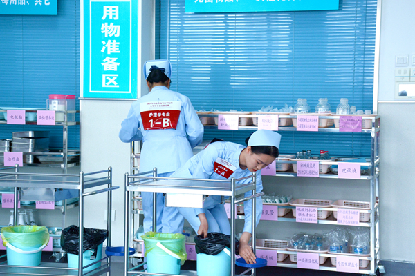此次竞赛以案例为主线,在健康评估基础上重点考核学生的临床思维能力和操作技能,分设2个考评站点,选手首先在健康评估站合作完成临床案例分析(笔试),并结合案例确定3项主要护理操作,在临床技能操作站点每人完成1项。技能涉及静脉输液、心肺复苏、心电监护、皮试、肌肉注射、生命体征监测、鼻饲、吸氧、吸痰等九项。