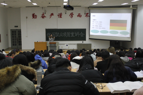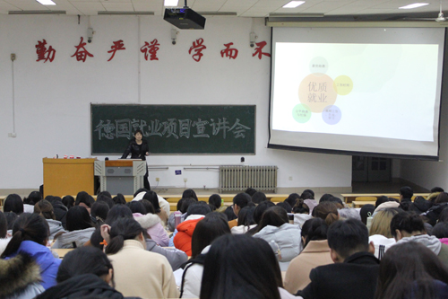 12月13日晚,护beat365官方网站在教学南楼C1014教室举办了德国就业项目宣讲会。山东省外派护士基地孙美岩和李雅倩为我院应届实习生进行宣讲。