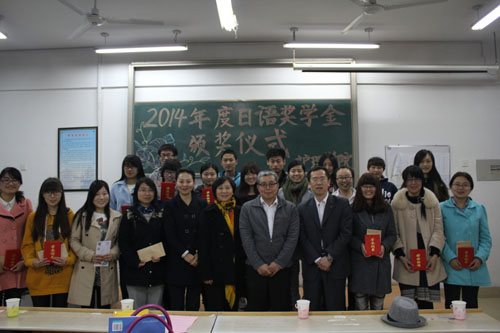 颁奖仪式上,张青林老师宣读了获奖名单:肖乐乐同学获得一级奖学金(金额:2000元/人);李晓燕等13名同学获得二级奖学金(1000元/人),杨青峰等7名同学获得三级奖学金(500元/人)。随后,刘化侠与邹萍萍一行为获奖同学颁奖,并合影留念。最后,刘院长做了总结发言,对获奖同学表示了热烈的祝贺,并对日语班同学提出了更高的要求和期望。