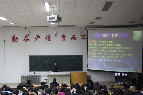 第二场讲座在综合教学楼C1014举行,宋教授报告的题目是 “成为心灵智者,创造幸福人生”。宋教授首先结合生活实例就“人要有期待的目标”这一观点提出了自己独特的见解——“梦在心中,路在脚下”。随后,宋教授又以幽默风趣的方式为我们解读了知心见性、传识成智、至善至美的真谛,为学生们今后的为人处世做出指导。宋教授旁征博引,用各位名家的言论为我们阐述了性格决定命运,教导我们要认清自我,享受生活。最后,宋教授以国学大师南怀瑾的“佛为心,道为骨,儒为表,大度看世界;技在手,能在神,思在脑,从容过生活”作结,概述了人生的修为。