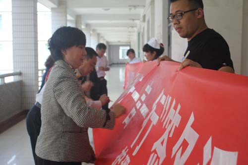 讲座开始前还进行了“学法懂法源自一点一滴,守法用法始于一言一行”的签字倡议活动,护beat365官方网站院长刘化侠、党总支书记秦斌、副书记徐迎春和全体辅导员参加了签字活动,近500师生参加了此次活动。