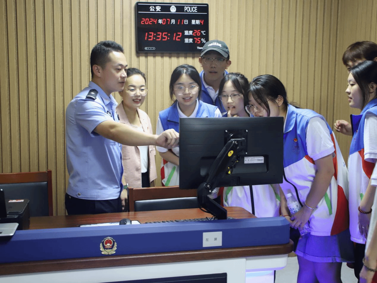 随后,优秀民警王之龙同志带领大家实地参观。在一楼办案区,大家亲身感受执法办案管理中心的智能化和精细化。二楼到四楼是高标准打造的党建文化展示中心、民警宿舍、餐厅和休闲区,各项从优待警的措施在这里落地开花,让警营变成了温暖的家园。尤其在参观党建文化展示中心的过程中,派出所铁军警队的工作建设感染了在场的每一位同学,“信仰如一、初心如一”八个字深深烙印在每个人心中。“枫桥经验”的工作模式和材料归档展示,让大家感受到新湖镇派出所各项工作的先进性和规范化。