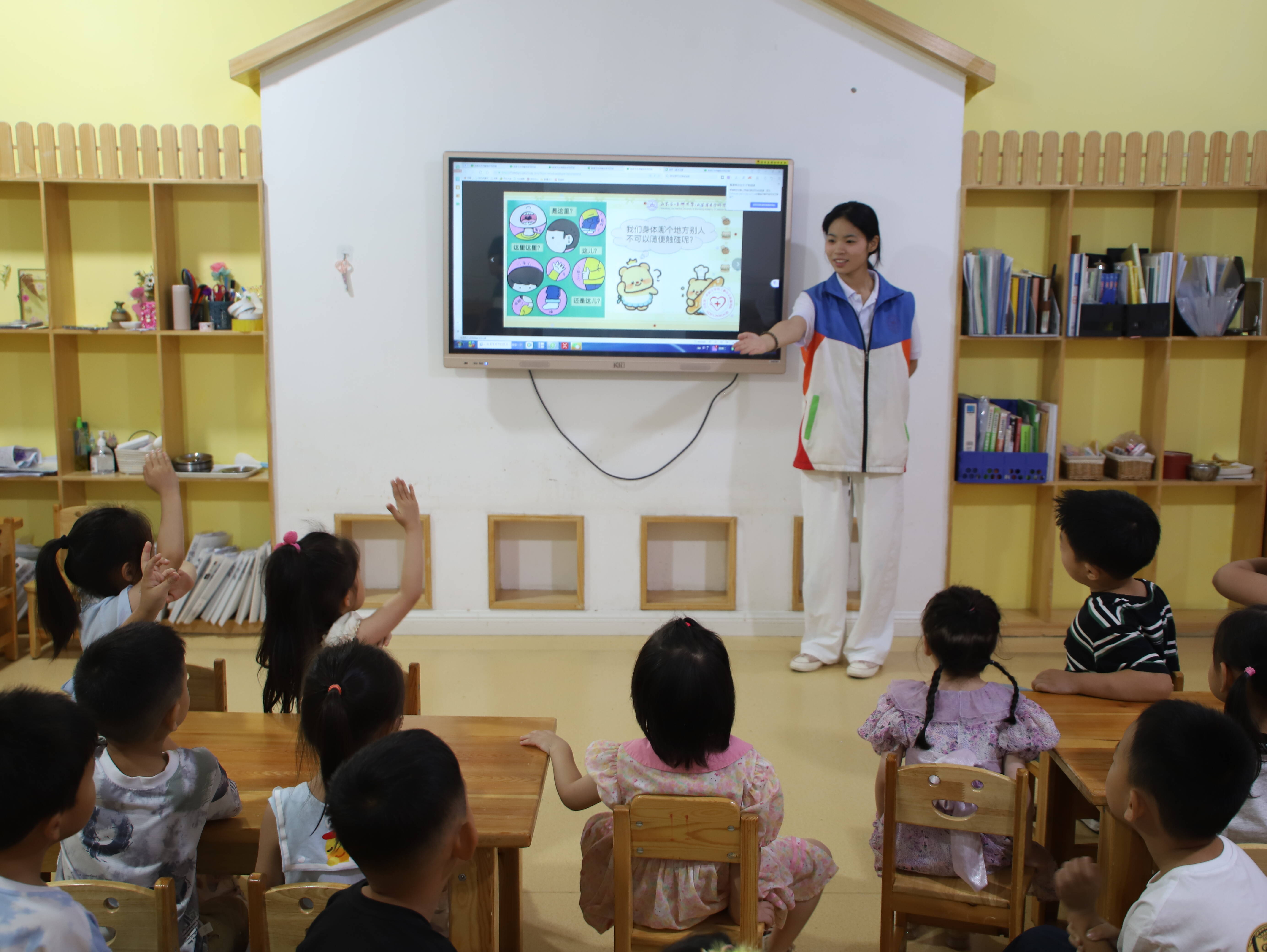 为深入学习贯彻习近平新时代中国特色社会主义思想和党的二十大精神,践行“青春为中国式现代化挺膺担当”的活动主题,7月10日,beat365官方网站“生命树”志愿服务队走进泰安市北京博苑鑫诚幼儿园开展“七彩假期”暨暑期“三下乡”社会实践活动,围绕情绪管理与性教育两方面展开科普。