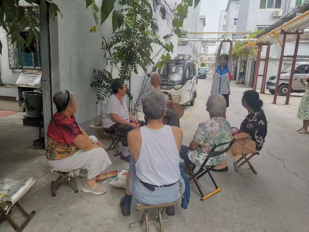 活动伊始,队员们邀请老人围坐在一起,不仅为他们详细介绍了八段锦的起源、历史以及练习技巧等基础知识,还特别强调了八段锦每个动作各自的中医学内涵及其相应的功效,帮助居民们深入了解这一传统健身方法背后的智慧与哲理。