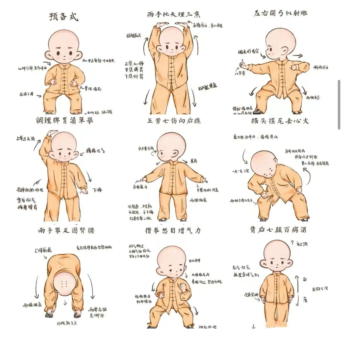 八段锦对内脏及气血、经络具有显著的保健作用,包括“双手托天理三焦”“左右开弓似射雕”“调理脾胃须单举”“五劳七伤往后瞧”“摇头摆尾去心火”“两手攀足固肾腰”“攒拳怒目增气力”“背后七颤百病消”八个动作,长期练习可以有效促进血液循环,增强机体免疫力,对于预防和治疗如高血压、心脏病、糖尿病、胃肠病、失眠等常见疾病有着良好的效果,是中医养生智慧的生动体现。