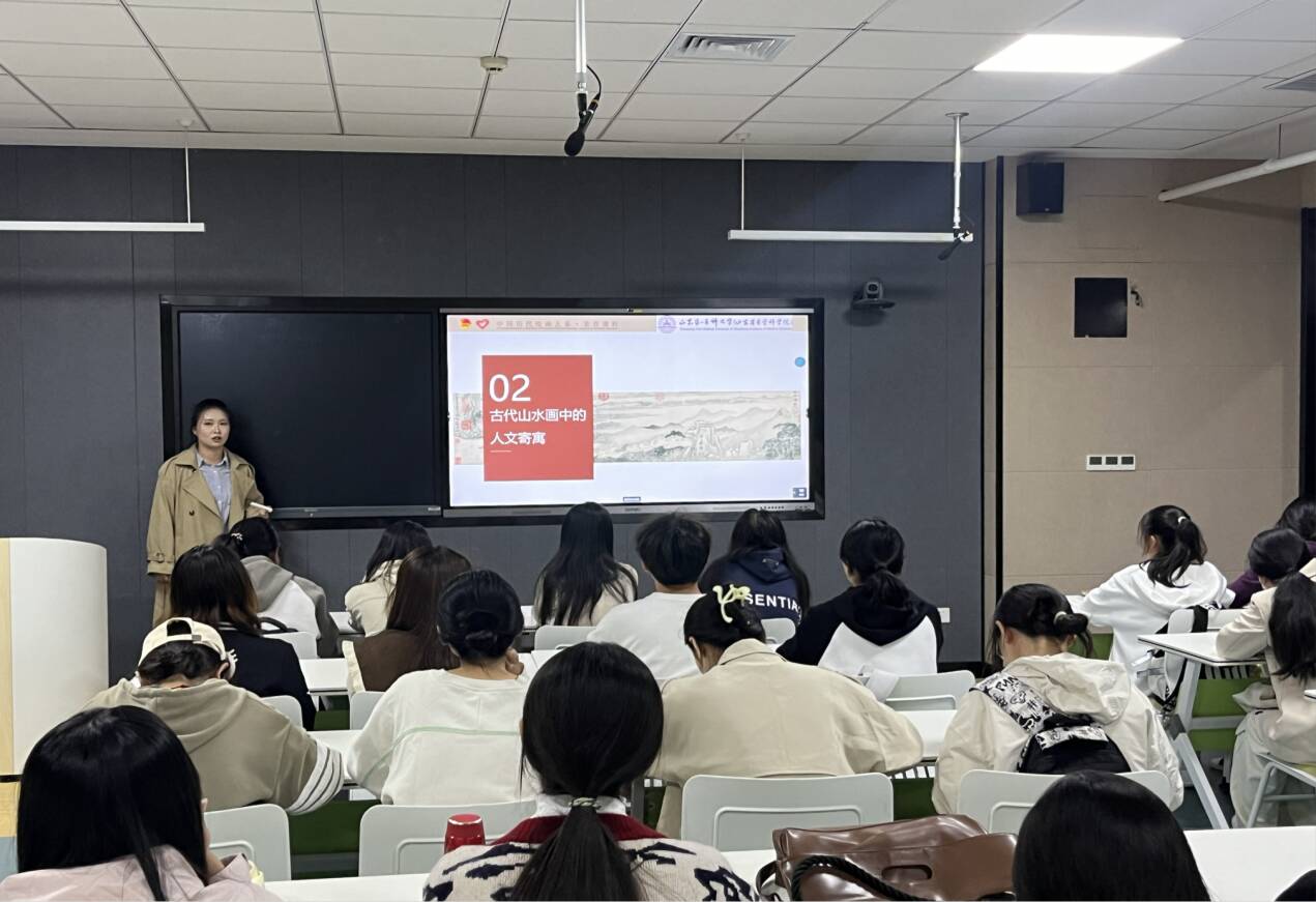 本次活动中,宣讲团成员充分利用多媒体资源,通过精心制作的PPT和视频影像,为观众带来了一场心灵与视觉的双重盛宴。通过一系列精美的演示材料,宣讲团成员生动地展示了中国古代山水画的无限魅力。他们从山水画的基本要素谈起,剖析了山水画如何通过笔墨技法、色彩与构图,传达出画家的情感寄托与哲思,进而揭示了其在中国文化史上的独特地位与深远影响。他们不仅介绍了山水画的发展,还着重讲解了不同历史时期山水画的风格变迁与山水画背后的人文寄遇,带领听众穿越时空,近距离感受那些流传千古的艺术佳作。活动过程中,同学们的参与热情高涨,纷纷就山水画中的人文情怀、技法创新以及艺术价值等问题与宣讲团成员展开交流,双方的交流不仅促进了知识的共享与深化,还营造了温馨融洽的互动氛围。