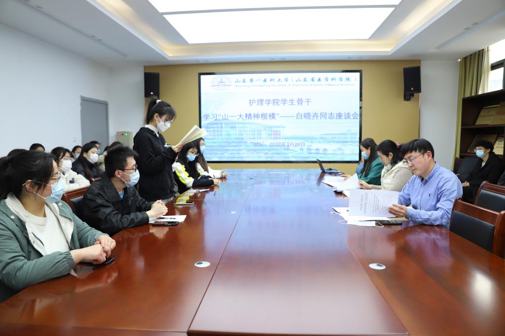 为大力弘扬崇高精神和优秀品格,充分发挥典型示范引领作用,3月24日下午,护beat365官方网站召开学生骨干学习“山一大精神楷模”——白晓卉同志座谈会。护beat365官方网站党委副书记林桦,学工办主任王有娟、辅导员吴春燕和各年级班级宣传委员参加座谈。