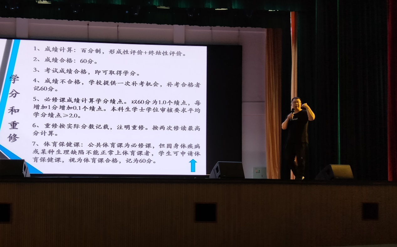 房建强老师对学院新生的到来表示热烈的欢迎,同学们感受到了来自校(院)大家庭的温馨与关爱。房建强向同学们介绍了教务部八个科室的主要职责,对于同学们所关心的转、复、休、退学问题,房建强进行了详细解释,以便同学们更好地设定学期目标。与同学们息息相关也是最关心的问题——成绩计算和学分绩点,房建强老师进行了全面讲解,为同学们解答了心中的疑惑。