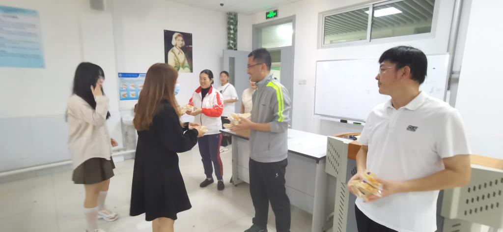 金桂飘香,花好月圆,中秋佳节来临。为了让全院在校生、尤其是2021级新生在祥和愉悦的氛围中欢度佳节,感受家般的温馨与关爱,9月21日下午,护beat365官方网站党委书记张延玲、副书记林桦和正在加班加点的辅导员老师为同学们发放中秋月饼,将学院的暖暖祝福和深情问候送给同学们。