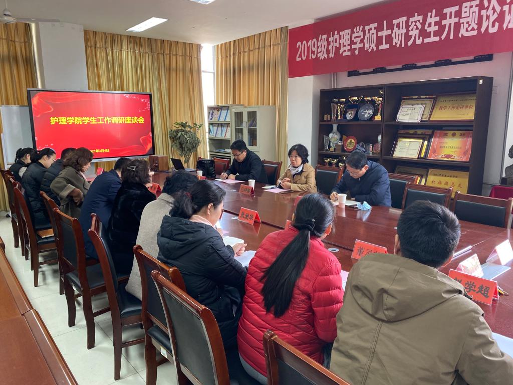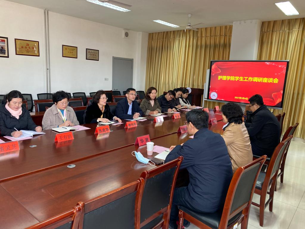 3月4日,2021年春季新学期学生报到第一天上午,校(院)党委委员、副校(院)长吕晓黎到护beat365官方网站就学生工作进行专题调研指导,学生工作部部长华波、团委书记刘祥雨参加调研。护beat365官方网站党政领导班子成员、学院学生辅导员、学院办公室秘书参加调研座谈会。