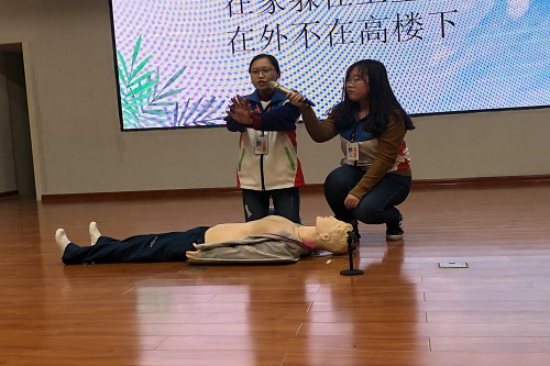 此次活动以宣讲包扎、鼻出血、避震和心肺复苏为主要内容。首先,队员向学生们讲解了包扎的临时材料,例如毛巾、床单、衣物等具有弹性的物品。随后,队员们邀请同学们上台互动,近距离学习简易的包扎方法。在宣讲的同时,志愿者们还走下讲台,与同学们互动。服务队队员还给同学们普及避震知识,教同学们利用身边的物品进行避震。随后,服务队队员还给同学们演示了心肺复苏的过程,让大家体验了救人的使命感。