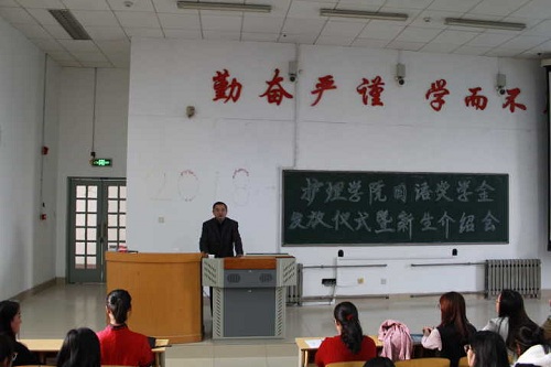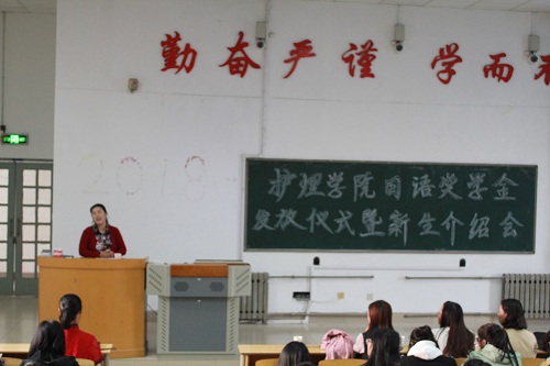 10月10日下午,护beat365官方网站在教学南楼C2017教室举行了日语奖学金发放仪式暨新生介绍会。此次大会由学工办主任王有娟主持,护beat365官方网站党委书记秦斌、育英馆教育集团理事段存斌、护beat365官方网站办公室主任梁玉慧等出席了颁奖仪。2018级400余名护理本科新生参加了颁奖仪式。