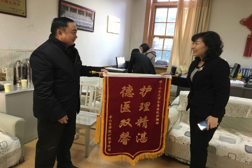 为了表达齐鲁医院护理部对我院实习学生的无私关爱与照顾,一行三人为护理部送了“护理精湛 德医双馨”的锦旗。