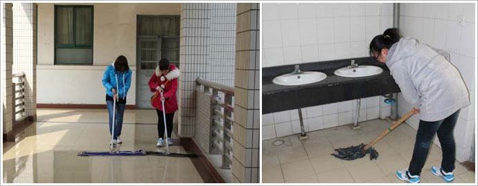 南丁格尔志愿服务队员在林桦老师带领下走进教学北楼清洁工办公室,了解教学区清洁工一天的工作流程和作息时间,学习清洁工的工作方法,随后,学生分为若干小组,在清洁工的带领下在各楼层开始了一天的清洁工作。从打扫走廊到清洁卫生间再到打扫教室,收拾桌洞垃圾,清理桌面上乱写乱画的污渍,同学们干得十分起劲,完全融入了自己的“新角色”,也得到了清洁工阿姨会心的微笑和赞许。